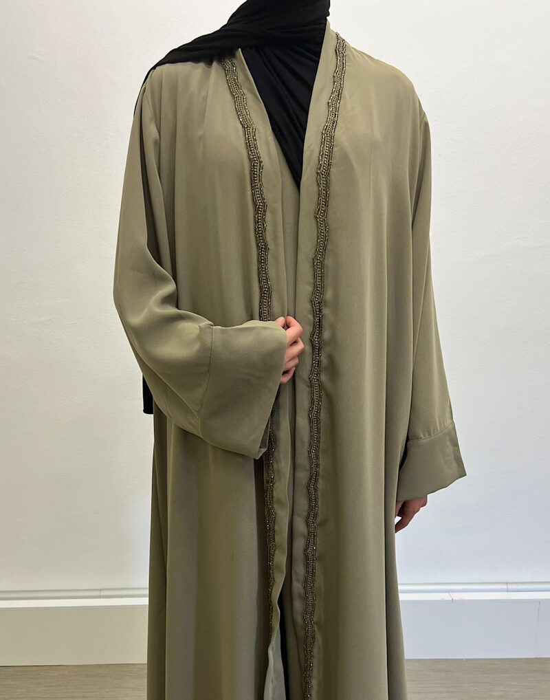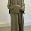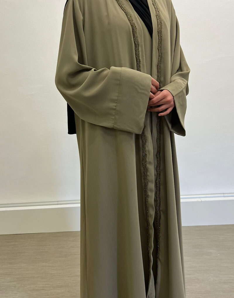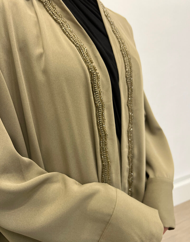Découvrez l’ensemble Emiraty kaki, composé d’une sous-robe élégante et d’un kimono raffiné. Tout d’abord, il s’adresse à la femme musulmane moderne en quête de pudeur et de style. Ensuite, sa coupe fluide apporte confort et légèreté au quotidien.