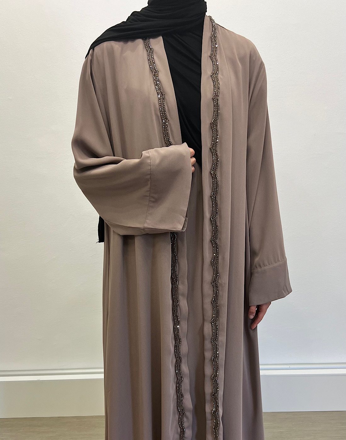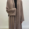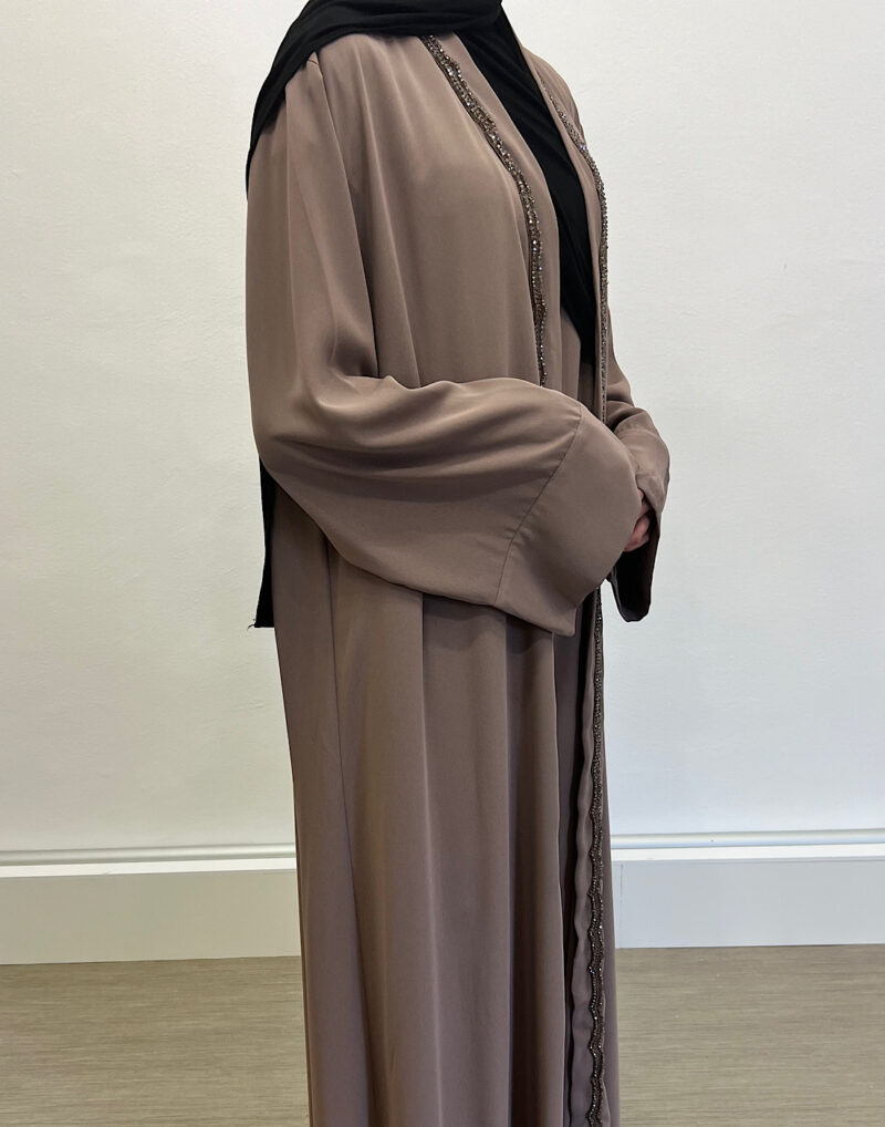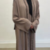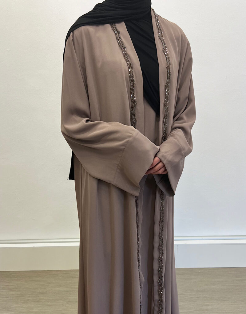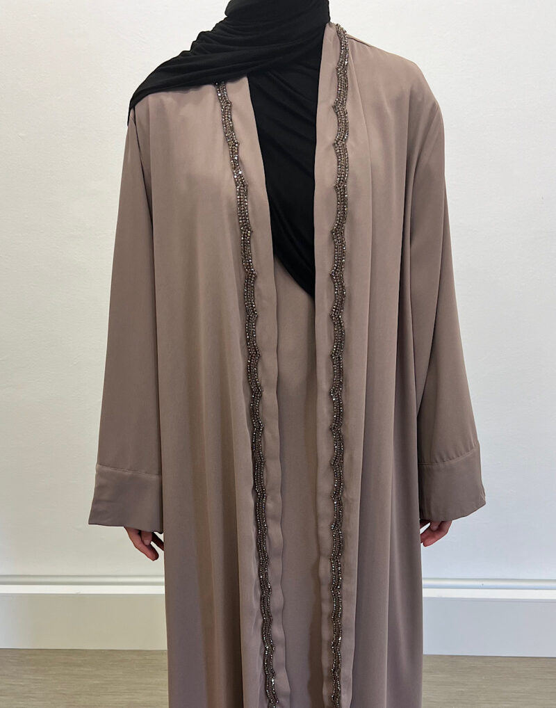 Découvrez l’ensemble Emiraty taupe, composé d’une sous-robe élégante et d’un kimono raffiné. Tout d’abord, il s’adresse à la femme musulmane moderne en quête de pudeur et de style. Ensuite, sa coupe fluide apporte confort et légèreté au quotidien.